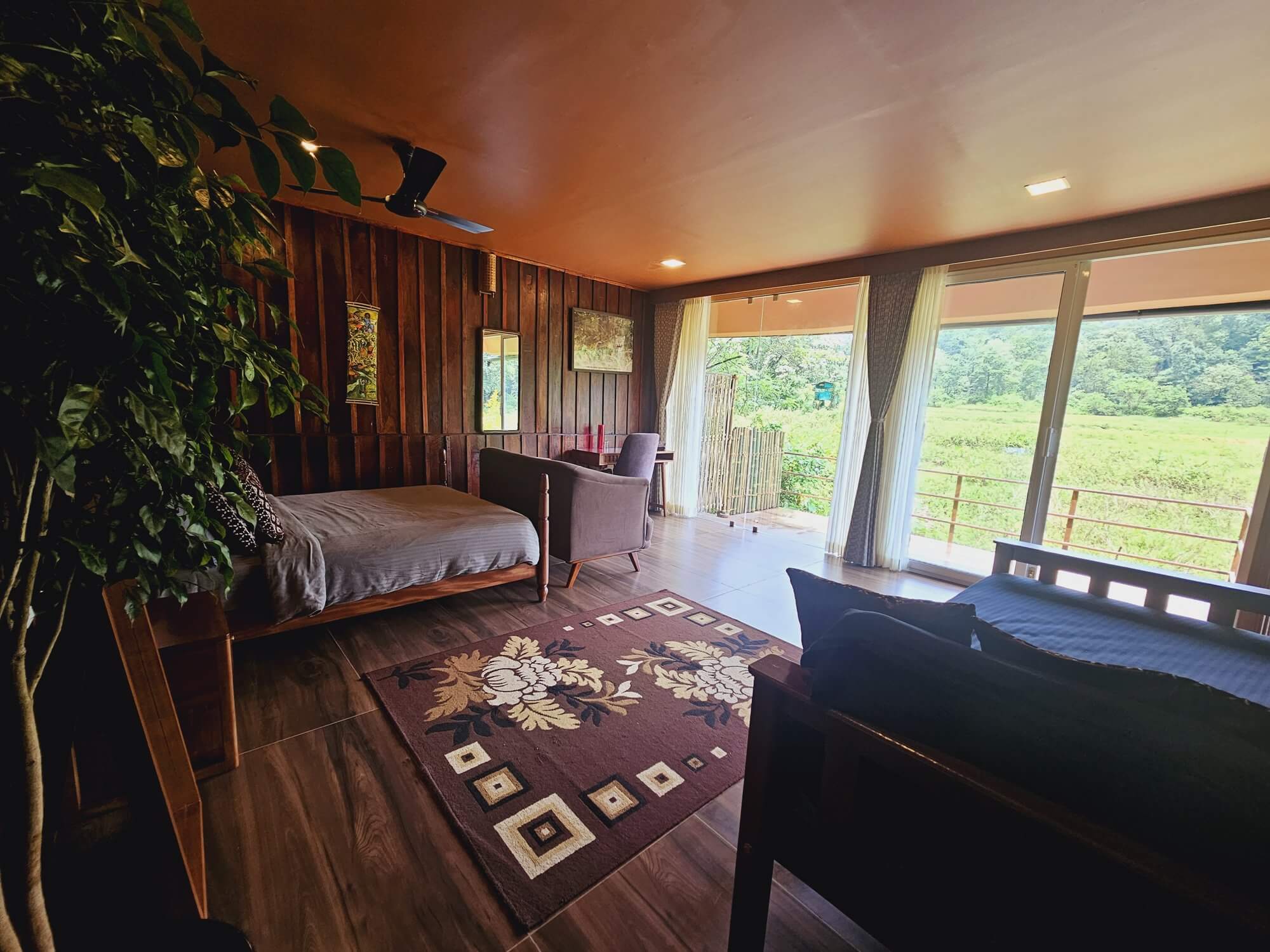 The 2 bedroom twin villa has 2 bedrooms, 2 fully equipped bathrooms, and 2 separate large balcony. These are the largest rooms we have in the Retreat and it can comfortably sleep 2 to 3 adults. It has one large double bed and one single bed in each of the rooms, the large balcony faces the jungle and also gives a partial view of the meadows and waterhole.